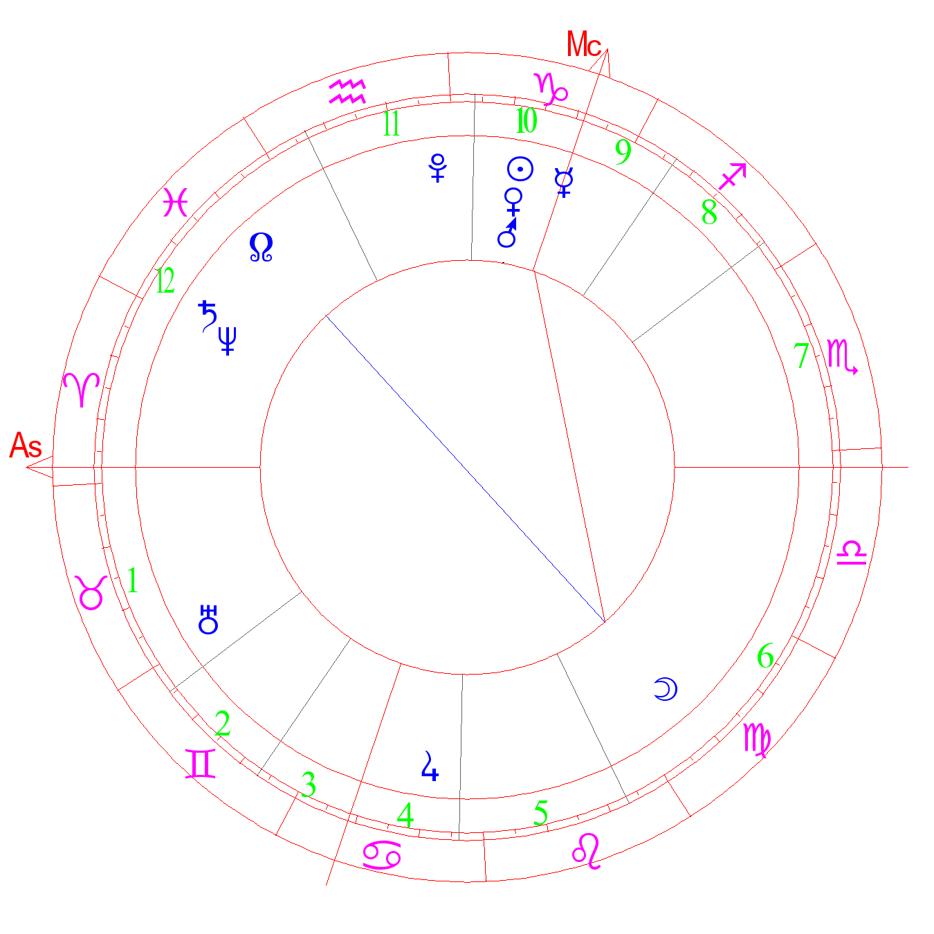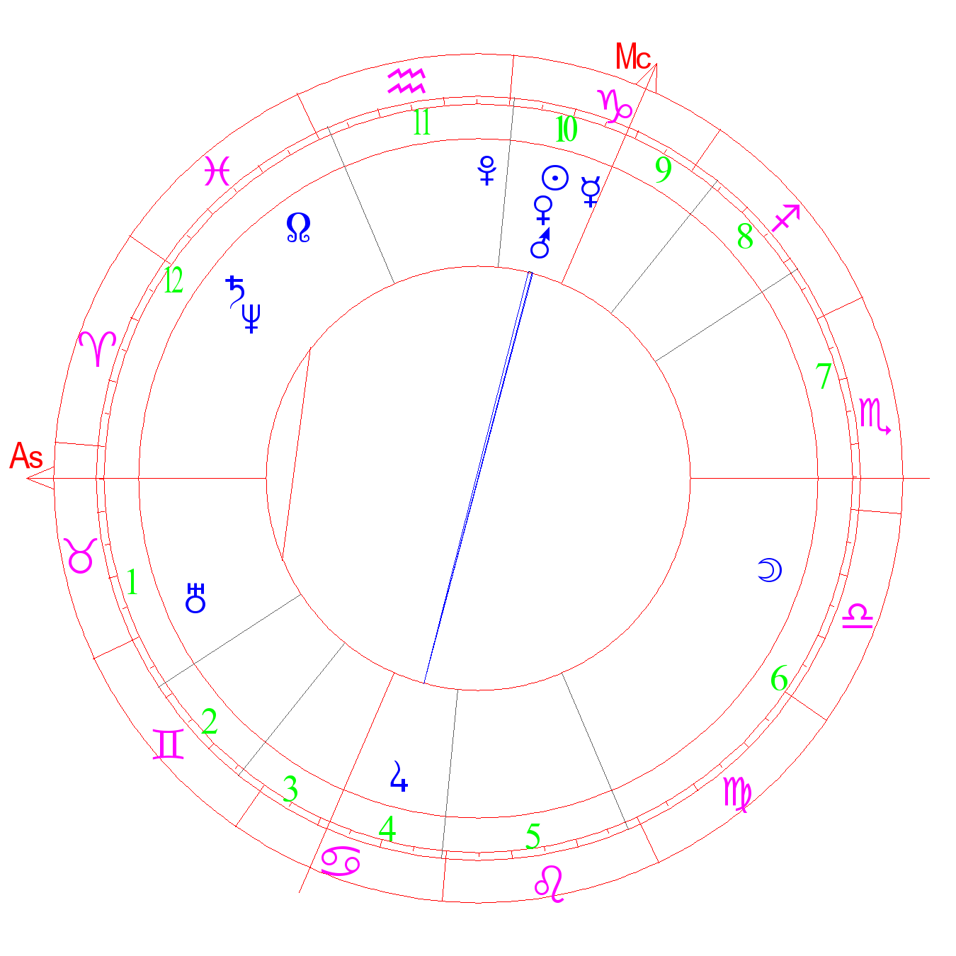 A heavy degree, taxing one’s powers. Suicide. A boring life, perpetual preoccupation, bearing the Cross, no moment of free time. Complaints, whining, lack of power. The situation is difficult to achieve using one’s own efforts. With strong air elements and signs of the movable cross- there is a tendency to theft, deception, fraud, kleptomania (ASA). Diligence, continuity, perseverance, success on one’s own, ability to paint, medicine and agriculture. The degree of Saturn (Kefer). Degree of erudition (deVore)